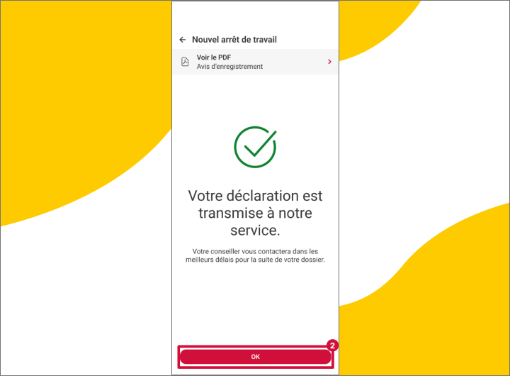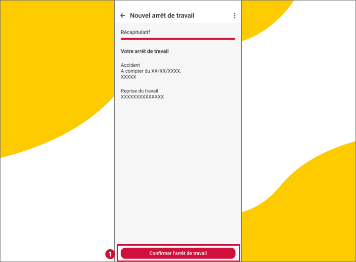 - Je relis attentivement les informations renseignées, puis je les confirme en appuyant sur le bouton rouge "Confirmer l'arrêt de travail" en bas de la page