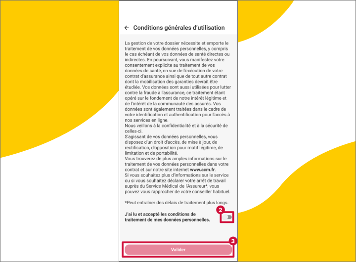 - Lorsque j'arrive sur la page "Conditions générales d'utilisation", je lis les conditions et j'accepte le traitement de mes données personnelles (obligatoire pour poursuivre)