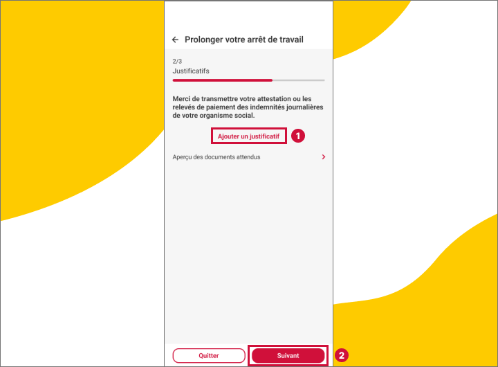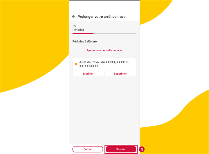Les informations concernant la prolongation de mon arrêt de travail s'affichent. - Je vérifie que mes informations sont correctes, puis j'appuie sur le bouton "Suivant" pour continuer